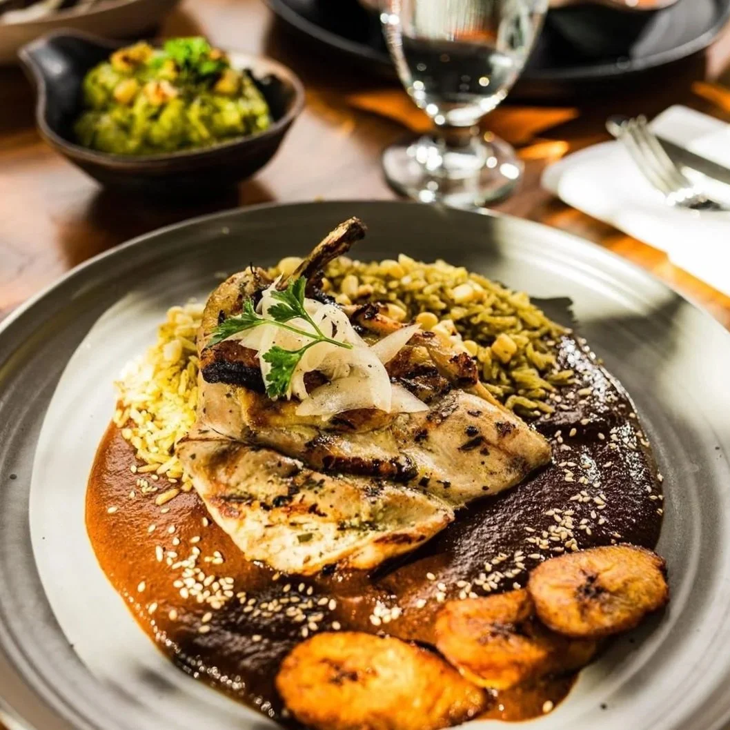 8oz jidori chicken | black mole | rice | fried plantains | sesame seeds | served with tortillas